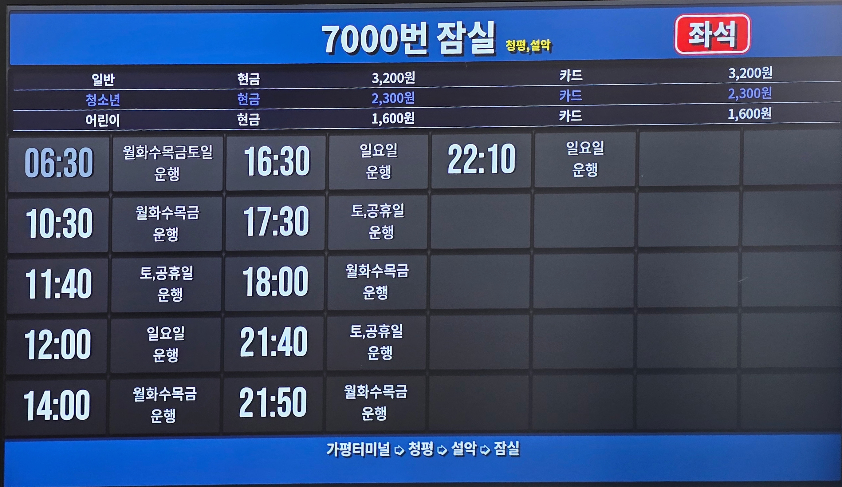 가평에서 잠실가는 7000번 버스는 가평을 출발하여 청평,설악을 경유하여 잠실까지 운행하는데 운행 버스 요금은 3,200원입니다.